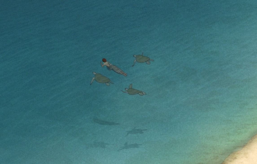 پدر میخواهد فداکاری کند، اما مادر مانع میشود: فداکاری واقعی، شتاب نکردن و اجازه دادن به کودک است تا خود نجات یابد. از دور شنا میآموزد؛ کودک خود را نجات میدهد و با لاکپشتها همبازی میشود، دوزیست بودن را میآموزد.