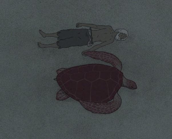 لاکپشت قرمز، که دوزیست بودن را میداند، به خشکی میآید؛ اما مرد، خشمگین از شکستن قایقهایش، آن را میکشد.